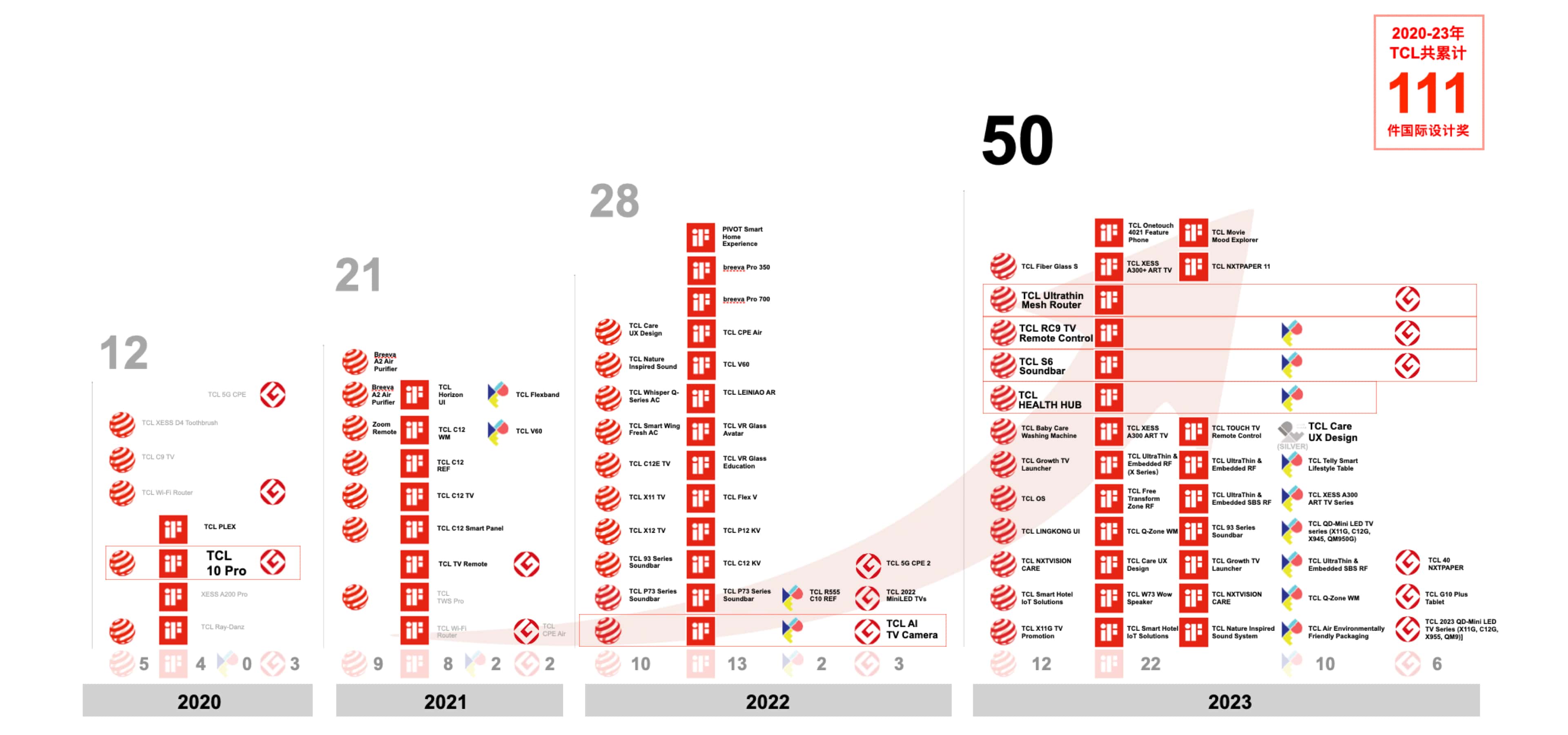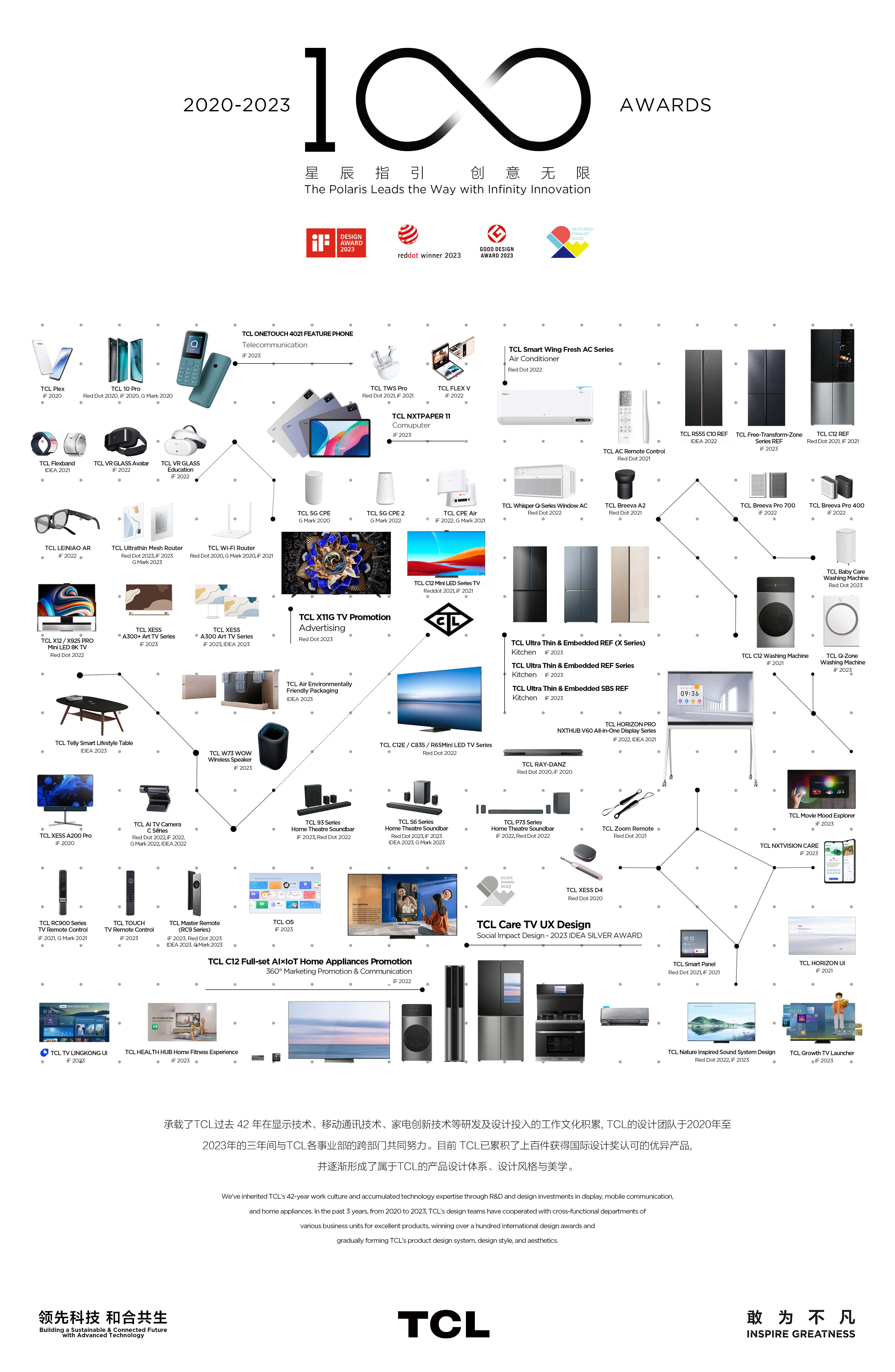 From 2020 to 2023, TCL has accumulated 111 international design awards, which marks a milestone breakthrough for TCL on the international design stage and is also a strong testament to TCL's persistent innovation exploration and unremitting pursuit of excellent design. In just over three years, from its initial emergence to the numerous fruits of today's 100 international design awards, TCL has followed the road of 42 years of innovation, drawing a future blueprint with infinite possibilities with excellent design and ingenuity.