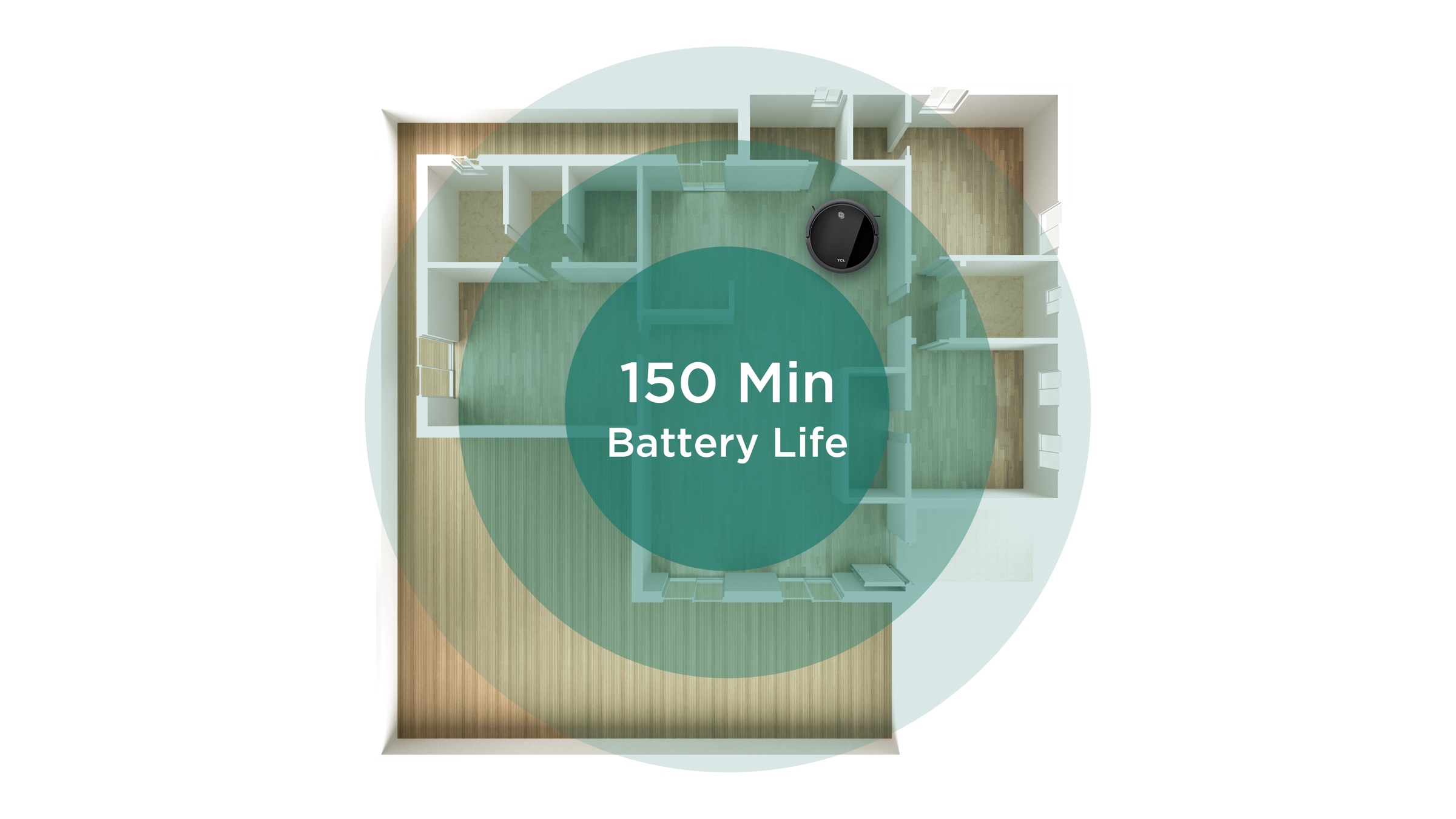 150 min run time on a single charge *Sweeva device is tested operating under standard suction power on hard floor