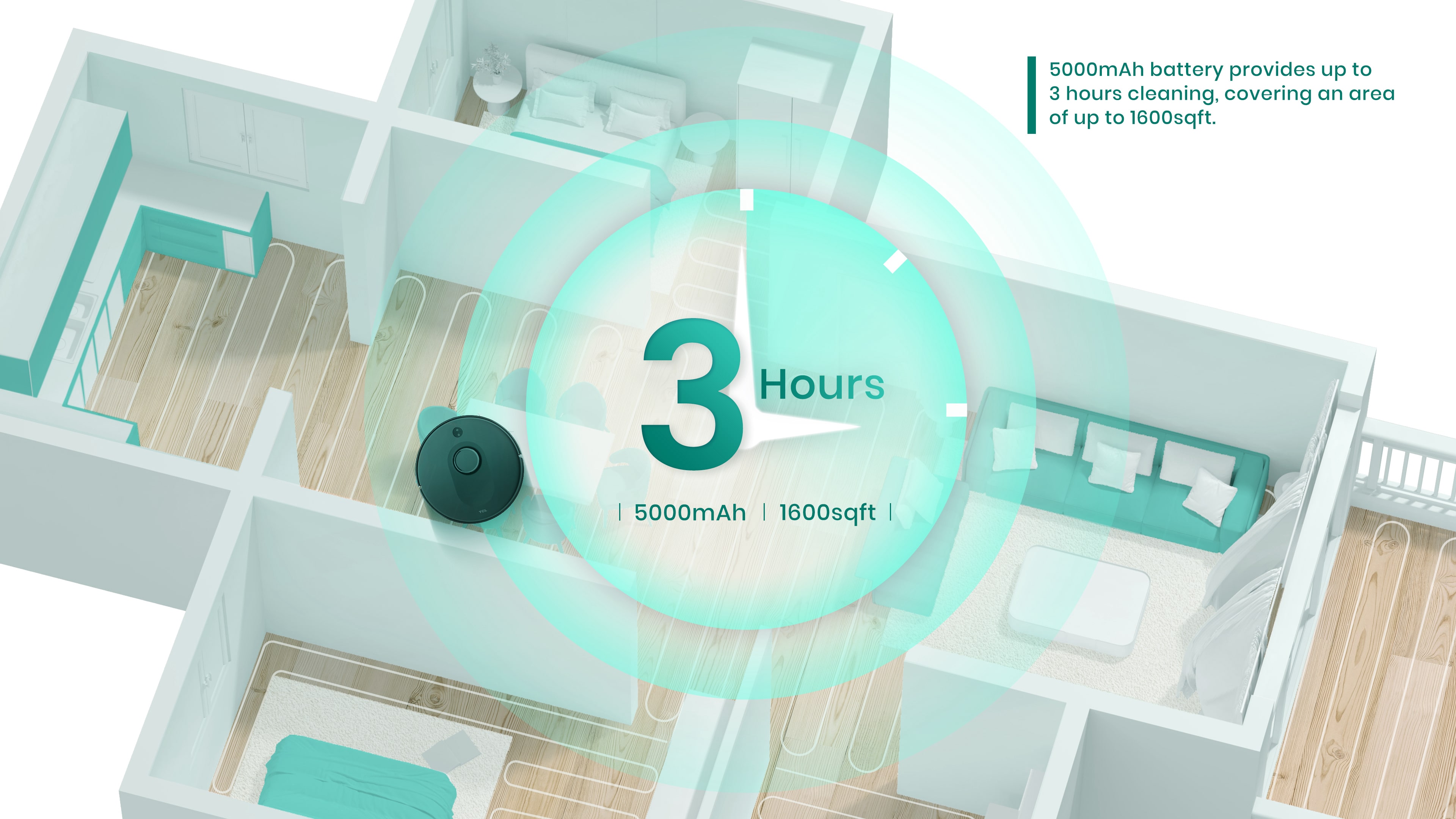 5000mAh battery provides up to 3 hours cleaning, covering an area of up to 1600sqft