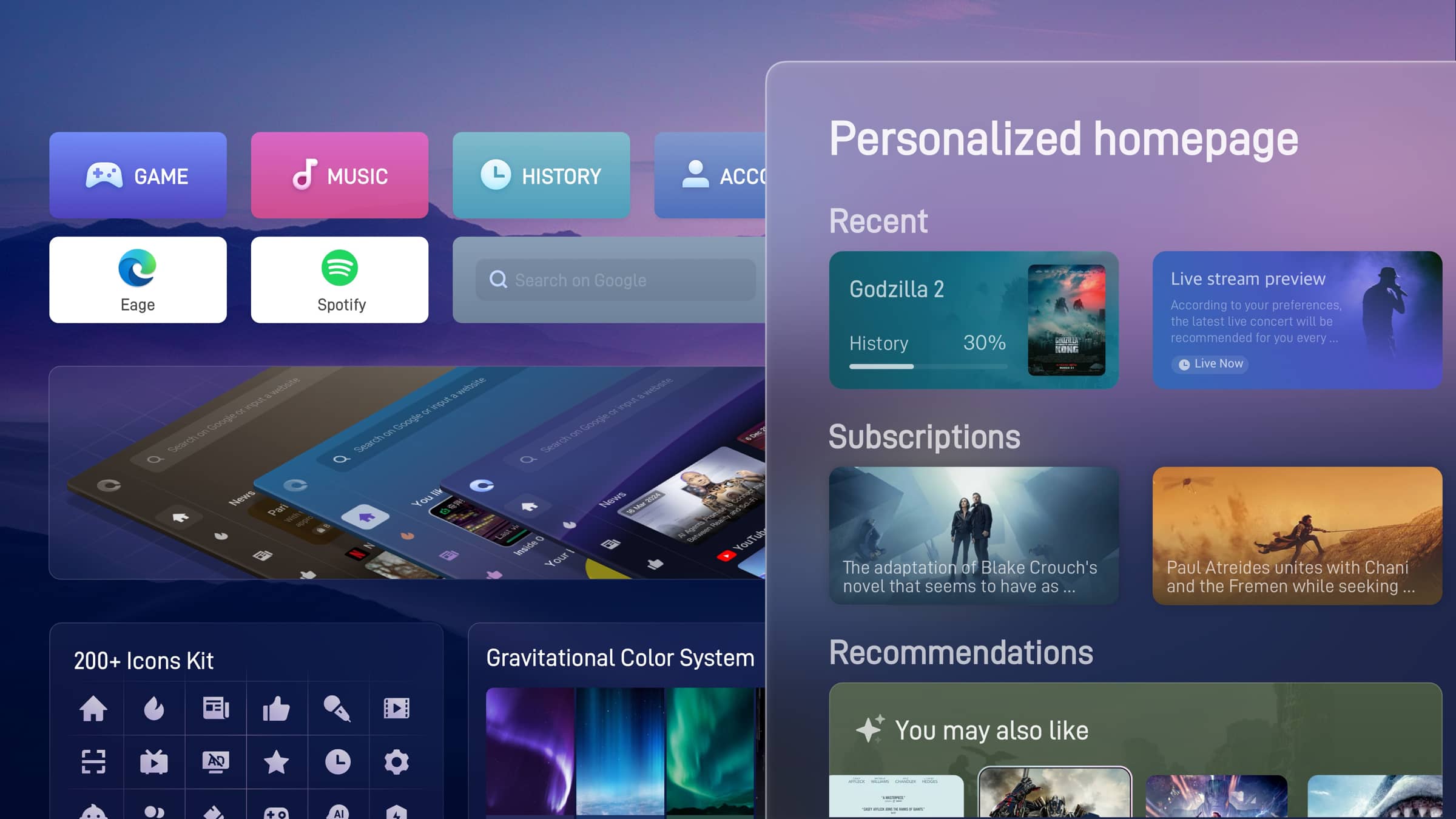 TCL BrowseHere's multi-account family feature offers unique UI themes for each member, providing a refreshed visual experience with each switch. Users can subscribe to content based on personal preferences, receiving personalized recommendations. To address TV input difficulties, we integrated advanced voice capabilities, enabling accurate searches through vague voice descriptions. For better web interaction on TV, we designed a convenient toolbar based on frequent user actions, allowing quick web browsing with a single remote control button.