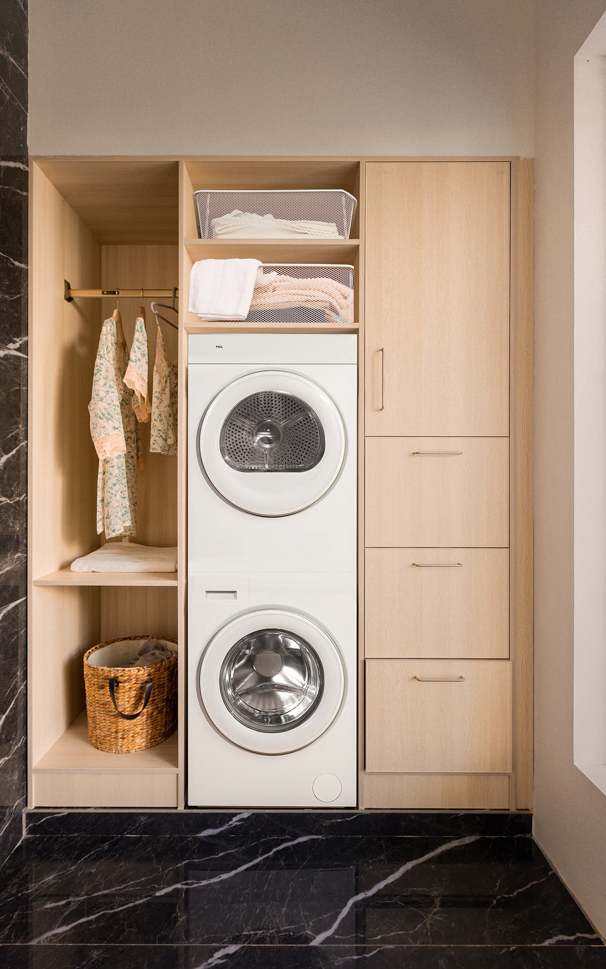 TCL Twin Drum Washing & Drying Set seamlessly combines washing and drying functions with innovative design. Its ultra-thin design offers a stylish, flush-front appearance, blending seamlessly into any living space. The Three-Dimensional Garment Care system, featuring six lifting ribs, elevates the washing process for both efficiency and clothing protection. Moreover, the platform effortlessly shifts between an all-in-one machine and modular suite configurations, minimizing adjustments and resource usage during development. This product embodies eco-consciousness and efficiency, making it an elegant, forward-thinking choice for laundry needs.